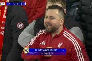 登場時(shí),阿諾德遭到了紅軍球迷的“熱烈歡迎”:安菲爾德噓聲四起,鏡頭給到的一位球迷向他手指著胸前的利物浦隊(duì)徽,口中念念有詞,隨后這位球迷還低頭親吻了隊(duì)徽。