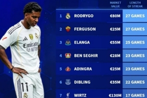 1、羅德里戈(皇馬)27場,身價8000萬歐