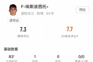 體育資訊6月26日訊 世俱杯小組賽,E組第3輪,國米2比0擊敗河床。其中巴斯托尼打滿全場,并為球隊攻進(jìn)鎖定勝局1球。賽后媒體為巴斯托尼打出評分8分,他也被評分本場最佳球員。