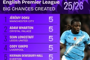 本賽季英超創(chuàng)造重大機(jī)會榜: