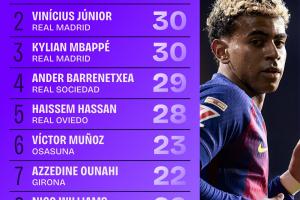 體育資訊11月12日訊 巴薩亞馬爾、皇馬的姆巴佩和維尼修斯,他們?cè)谶^(guò)人突破方面,都有著非凡的天賦。在2025-26賽季西甲聯(lián)賽中,據(jù)Squawka數(shù)據(jù)統(tǒng)計(jì),亞馬爾在過(guò)人次數(shù)排行榜單居首。