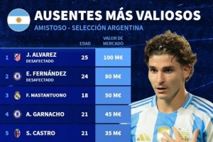 體育資訊11月12日訊 德國轉(zhuǎn)會(huì)市場統(tǒng)計(jì)了缺席本期阿根廷隊(duì)球員的身價(jià),并列出榜單,阿爾瓦雷斯1億歐居首,恩佐-費(fèi)爾南德斯8000萬歐次席。