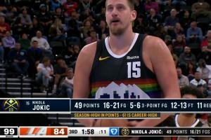 三節(jié)結(jié)束,約基奇52分11籃板6助攻1搶斷1蓋帽,22投17中,三分6中5,罰球14罰13中!各節(jié)得分分布:25+8+19。