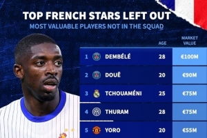 體育資訊11月14日訊 德國轉(zhuǎn)會市場統(tǒng)計了無緣本期法國隊名單球員的身價,并列出榜單,登貝萊1億歐居首。