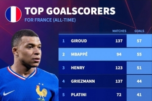 體育資訊11月14日訊 世預(yù)賽歐洲區(qū)比賽,姆巴佩梅開二度,法國主場4-0擊敗烏克蘭。姆巴佩為法國隊(duì)攻入55球,差2球追平隊(duì)史射手王吉魯。