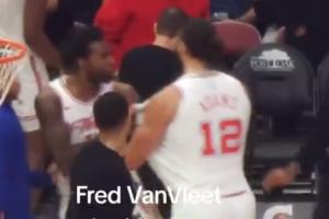 昨日第三節(jié)結束,伊森和亞當斯有些沖突,互相拉拽球衣,火箭助教迅速介入拉開雙方。火箭其他球員也有些懵……