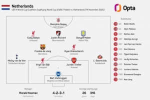 體育資訊11月15日訊 世預賽歐洲區(qū)小組賽,荷蘭前往客場挑戰(zhàn)波蘭。本場比賽,荷蘭排出的首發(fā)陣容中沒有任何一名意甲球員,2018年9月9日以來的正式比賽首次出現(xiàn)如此局面。