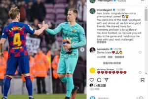 特爾施特根社媒曬出與拉基蒂奇在巴薩的合照,并寫(xiě)道:“伊萬(wàn),兄弟,祝賀你度過(guò)如此輝煌的職業(yè)生涯!??????”