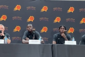 體育資訊7月8日訊 今天,太陽(yáng)為球隊(duì)新秀舉行了新聞發(fā)布會(huì)。10號(hào)秀馬盧阿奇(圖左二)接受了采訪。