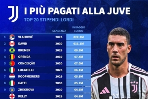 體育資訊11月20日訊 德國轉(zhuǎn)會市場統(tǒng)計(jì)了尤文球員的稅前年薪,并列出前二十名榜單,弗拉霍維奇2220萬歐居首,戴維1110萬歐次席。