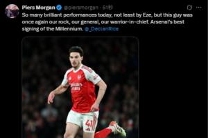 “今天有許多精彩的表現(xiàn),尤其是埃澤,但這位球員(賴斯)再次成為我們的后盾、將軍和帶隊?wèi)?zhàn)士。阿森納在千禧年最好的一筆引援!”