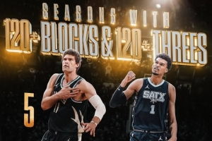 單賽季同時(shí)達(dá)成120+三分和蓋帽:大洛5次,文班2次,此外沒(méi)人能多次做到。