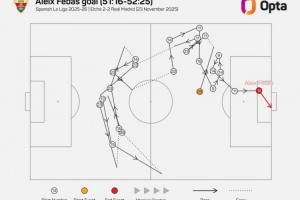 數(shù)據(jù)統(tǒng)計顯示,這粒進球經歷了22腳傳遞,是本賽季西甲第二多。