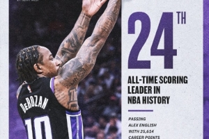 截至第四節(jié)中,德羅贊本場拿下了19分。至此他個人生涯總得分(賽前25596分)超越了英格利什(25613分),升至NBA歷史第24位。接下來德羅贊將追趕卡特(25728)。