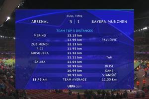 兩隊平均 阿森納11.43km 拜仁11.33km