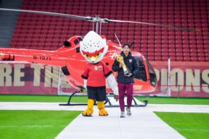 激動人心的奪冠視頻過后,大家的目光被靜候在內(nèi)場的臨港捷運紀念版直升機吸引,儀式開始前,這架直升機載著王燊超和獎杯從川沙飛抵球場。這一環(huán)節(jié)不僅是榮耀的展示,更是俱樂部積極探索“低空+足球”體旅融合新范式的生動實踐。隨后,王燊超與俱樂部總經(jīng)理沙良昌共同將新賽季冠軍獎杯安放于柱頂,與三座往屆火神杯組成“冠軍獎杯矩陣”,將現(xiàn)場氛圍推向高潮。