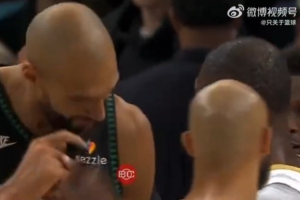 賽后發(fā)生有趣一幕,戈貝爾指著自己的腦門,對(duì)杰倫·布朗面授機(jī)宜,大致意思是別整發(fā)際線粉了,像我這樣多好。有趣的是,在這過程中另一個(gè)大光頭德里克·懷特從他倆身前走過。