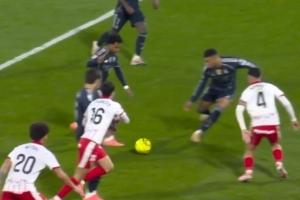 西甲第14輪,皇馬客場1-1戰(zhàn)平赫羅納,讀秒階段皇馬獲得絕殺機會,貝林厄姆禁區(qū)橫敲,正對球門的羅德里戈調(diào)整步點準(zhǔn)備射門,這時正對來球但側(cè)對球門的姆巴佩半路殺出,轉(zhuǎn)身兜射打偏。