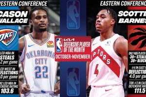 卡森·華萊士在10月和11月的比賽中場均送出2.2次搶斷(聯(lián)盟第一)、截斷5.0次(西部第一)、雷霆防守效率103.6聯(lián)盟第一。
