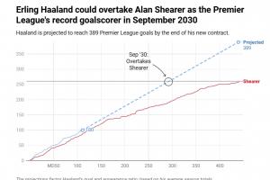 如果哈蘭德能保持目前的良好狀態(tài),直到他九年半合同結(jié)束,他最終將達(dá)到389球——比希勒多129球。