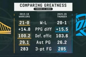 15-16賽季勇士以21勝0負(fù)不敗戰(zhàn)績(jī)開(kāi)局,本賽季的雷霆以20勝1負(fù)緊追其后。