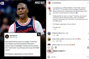 在為這支表現(xiàn)不佳的球隊(duì)奉獻(xiàn)了職業(yè)生涯一半的時(shí)間后,克里斯·保羅本打算回到快船隊(duì),以一個(gè)完美的賽季結(jié)束自己的籃球生涯。然而,在賽季開(kāi)始僅一個(gè)月后,這位即將退役的老將卻在深夜被球隊(duì)“送回家”。這一舉動(dòng)引發(fā)了球迷的強(qiáng)烈不滿,有球迷在推特上直言:“快船管理層的行為簡(jiǎn)直是犯罪?!?/p>