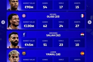 奧利塞(拜仁,23歲,法國):身價(jià)1.3億歐,62場,24球,27助攻