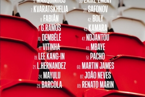 前鋒:7-克瓦拉茨赫利亞、9-貢薩洛·拉莫斯、10-登貝萊、19-李剛?cè)省?9-巴爾科拉、47-恩賈恩圖、49-姆巴耶