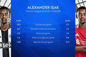 體育資訊12月06日訊 據(jù)天空體育數(shù)據(jù)統(tǒng)計(jì),伊薩克利物浦時(shí)期對(duì)比紐卡時(shí)期,觸球、射門等數(shù)據(jù)均下降。