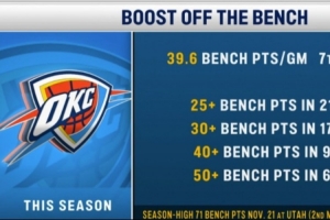本賽季的雷霆有13場(chǎng)比賽至少2名替補(bǔ)球員得分10+,3場(chǎng)比賽至少3名替補(bǔ)得分10+。