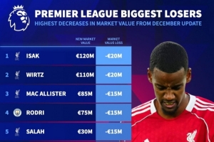 體育資訊12月9日訊 德轉(zhuǎn)更新英超球員身價(jià),伊薩克、維爾茨均-2000萬(wàn)歐,為本次更新身價(jià)下降最多的英超球員。