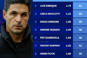 體育資訊12月11日訊 在本輪歐冠,阿森納3-0大勝布魯日,豪取6連勝。德轉(zhuǎn)也盤點(diǎn)了自阿爾特塔執(zhí)教阿森納歐冠首秀以來,各位主帥在歐冠同期積分榜(包括淘汰賽),具體如下(場(chǎng)均積分+總積分):