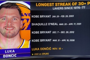 這是東契奇在湖人連續(xù)第9場砍30+,自1976-77賽季以來湖人隊(duì)史第四長,僅次于科比(16場、10場、9場)和奧尼爾(11場)。