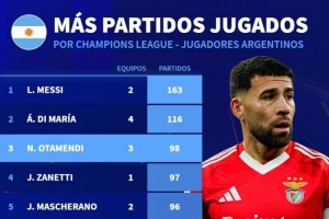 體育資訊12月12日訊 德國轉會市場統(tǒng)計了阿根廷球員的歐冠出場次數(shù),并列出榜單,梅西、迪馬利亞前兩名,奧塔門迪升至第三位。