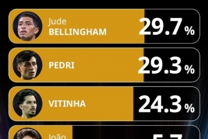體育資訊12月12日訊 環(huán)球足球獎公布了年度最佳中場的投票情況,貝林厄姆居首,佩德里次席。