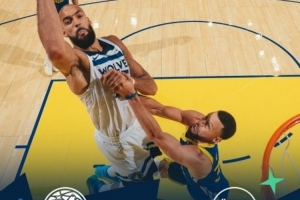 賽后森林狼發(fā)布贏球海報(bào),封面人物為戈貝爾,背景則是在內(nèi)線防守他的庫(kù)里。