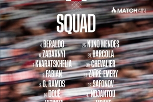 中場:8-法比安、17-維蒂尼亞、24-馬尤盧、33-扎伊爾·埃梅里、87-若昂-內(nèi)維斯