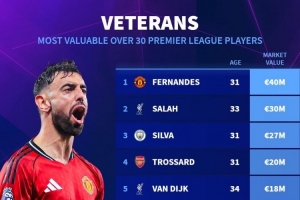 體育資訊12月13日訊 德國轉(zhuǎn)會市場列出了英超年齡30+球員身價排名,B費(fèi)居首,薩拉赫次席。