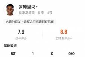 體育資訊12月15日訊 2025-26賽季西甲第16輪,皇馬對陣阿拉維斯,羅德里戈首發(fā)出戰(zhàn),打進(jìn)1粒進(jìn)球,1次過人成功,傳球成功率達(dá)到96.7%,評分7.9。