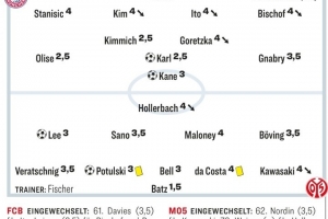 體育資訊12月15日訊 德甲第14輪比賽,拜仁主場2-2戰(zhàn)平美因茨,德國媒體《踢球者》對兩隊球員進行了評分,奧利塞、基米希、卡爾2.5分拜仁隊內最高。