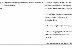 曹永競被處以停賽4場,其中包含其于2025年11月27日河內(nèi)公安對陣北京國安的比賽中被罰下所自動觸發(fā)的1場停賽。