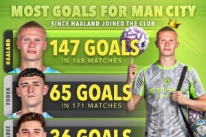 體育資訊12月15日訊 自從哈蘭德加盟曼城以來,他的恐怖進球效率已經不斷刷新多項紀錄。據(jù)score90數(shù)據(jù)統(tǒng)計,2022年夏天,自哈蘭德加盟曼城以來,球隊的射手榜單中,哈蘭德本人以168場打進147球斷層領跑,福登以171場打進65球排名第二。