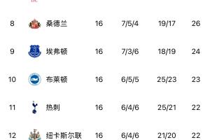 英超第16輪戰(zhàn)罷,前三強(qiáng)與后面的球隊(duì)拉開分差。英超從第5(水晶宮)到第15(布倫特福德)之間,僅相差6分。其中第5水晶宮、第6曼聯(lián)、第7利物浦、第8桑德蘭同積26分。