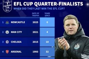 體育資訊12月16日訊 英格蘭聯(lián)賽杯八強(qiáng)戰(zhàn)即將開戰(zhàn),《轉(zhuǎn)會市場》也統(tǒng)計(jì)了八強(qiáng)球隊(duì)上次在聯(lián)賽杯奪冠距今的時(shí)間。