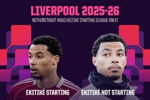 而當(dāng)埃基蒂克在英超未能首發(fā)時(shí),利物浦6場(chǎng)1勝1平4負(fù),場(chǎng)均打進(jìn)1球、獲得0.7分。