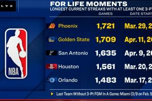 NBA球隊上一次出現(xiàn)全場沒進三分的情況還是在2016年2月6日(當(dāng)?shù)貢r間2月5日),該場比賽熱火全隊三分9中0。