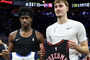 賽后,獨(dú)行俠狀元弗拉格和76人探花秀VJ·埃奇庫(kù)姆交換了球衣。