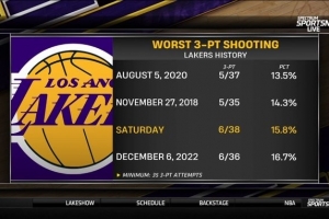 本場比賽湖人三分38中6,命中率15.8%,在隊(duì)史超過35次出手的比賽里,命中率排名第三低。