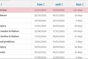 在2025/26賽季,遭遇感冒、小腿傷病和韌帶撕裂,預(yù)計(jì)缺席152天,預(yù)計(jì)錯(cuò)過23場比賽。