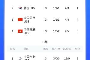 積分榜方面,U15中國隊與韓國U15同積4分,相互戰(zhàn)績一致(第二輪交手成績1-1),但小組凈勝球落后對手1球,最終排名第三收官。